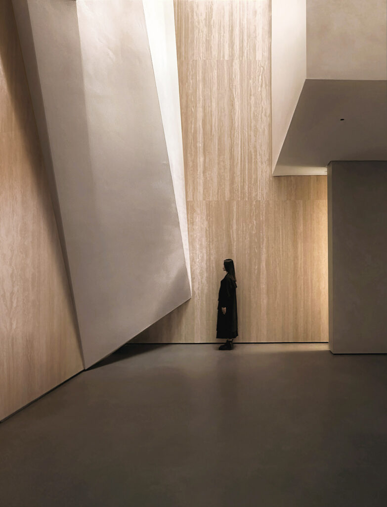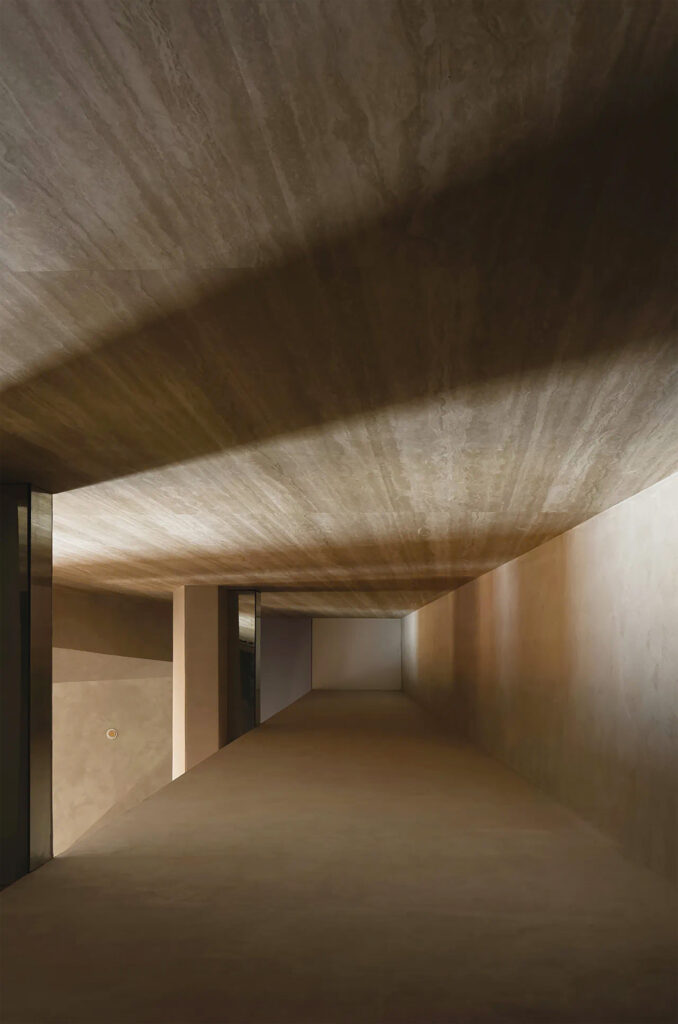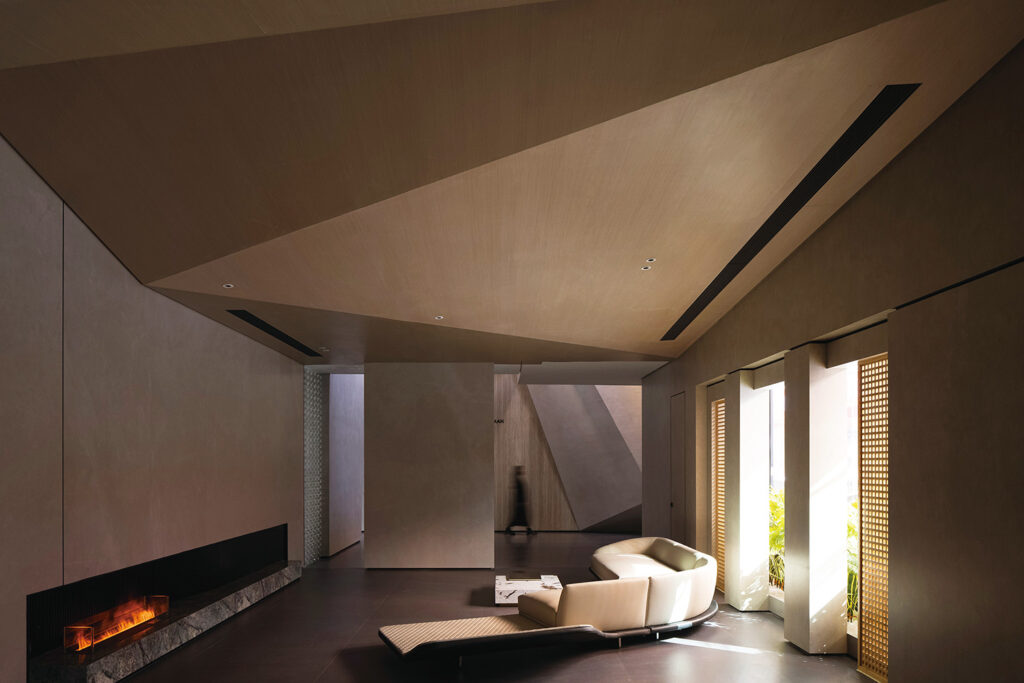 室內高挑的幾何形天花板與原始的岩板與金屬材料的完美結合