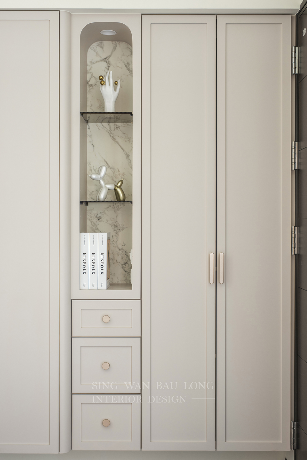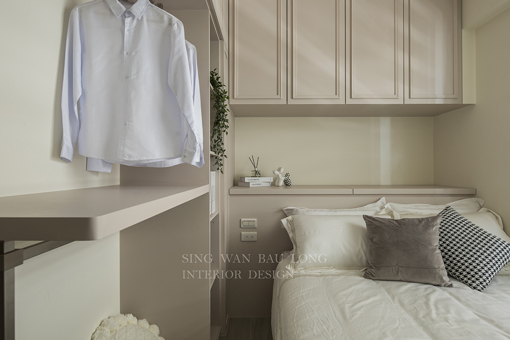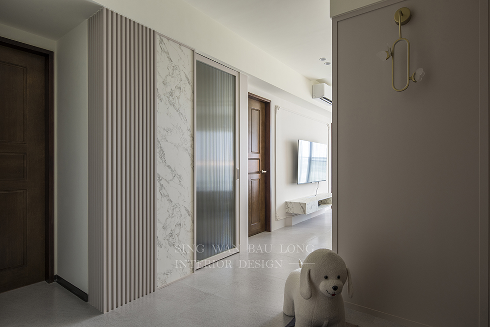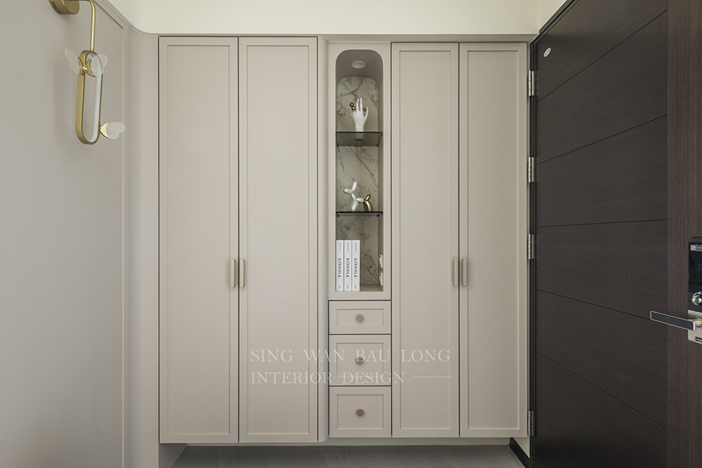 奶茶色烤漆、白色石紋美耐板、淺色木紋